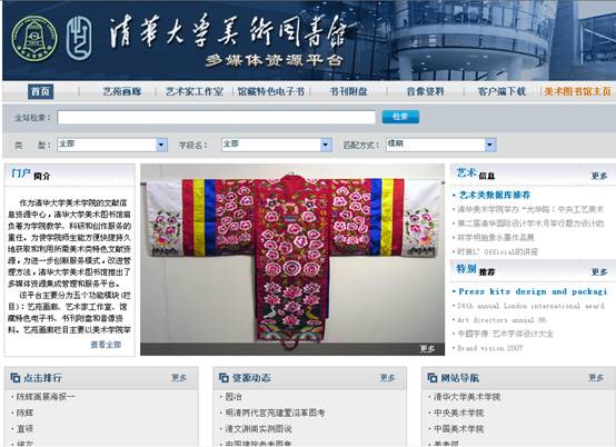 艺苑画廊栏目分为最新展览、染织服装艺术设计展、陶瓷艺术设计展、工业设计展、视觉传达设计展、环境艺术设计展、信息艺术设计展、工艺美术设计展、绘画展、雕塑展、摄影展、书法艺术展、毕业生作品展、综合展览、其他展览、艺术视频等16类。目前收录艺术图片2326张(占总量1/2)、自建艺术视频7个。艺术家工作室栏目目前只开辟了陈辉工作室、白小华工作室、武元子工作室、伊灵工作室、王专工作室、辛丹工作室等六个工作室。艺术家工作室包括艺术家简介、作品展示、视频访谈等内容。馆藏特色电子书栏目包括图书馆珍本书库收藏的民国时期国版美术图书241种、民国时期日版美术图书84种。导航树按照清华大学美术图书馆编制的《艺术图书分类法》大类粗分,含艺术理论、艺术史、基础图案、陶瓷、染织等19个大类。以后美术图书馆对这些图书在一般情况下不再提供原书提调服务。均通过其电子版图书提供阅览服务。书刊附盘栏目包括图书馆收藏的574种美术类图书所附的光盘(期刊附盘还没有做)。音像资料栏目包括图书馆购买的独立音像资料216种,主要为电影和世界著名大学介绍的片子。