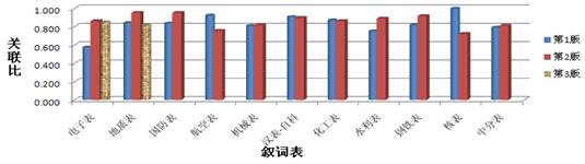 从表5的数据和图3直观来看,有6部叙词表新版本比较旧版的无关联比有所改善,其中《国防表》的关联比比较高,接近1。《航空表》在83年补充了《汉英主题词索引》,90年修订出版了字顺索引和分类索引两部分,虽然也增加和删除以及修改了大量的款目词,但是对表中的属、分、参关系一直未继续完善(故表6中未做新版参照度统计)。从统计数据看出,并非所有新版的关联比均比旧版的好,如《电子表》、《地质表》、《核表》、《化工表》4部叙词表词量上有了较大改善,但无关联词也大量存在着,这些无关联词的存在给用户查词、选词造成一定的困难。