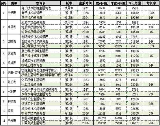 由于数据资源有限,笔者只详细调查了前11部叙词表的不同版本(余下11部只列出了最后版本信息),并从整体结构到内部使用性能做了一些统计分析,最后对我国近30年来叙词表修订情况做一简要概述,以期为今后我国叙词表编制或修订提供参考。